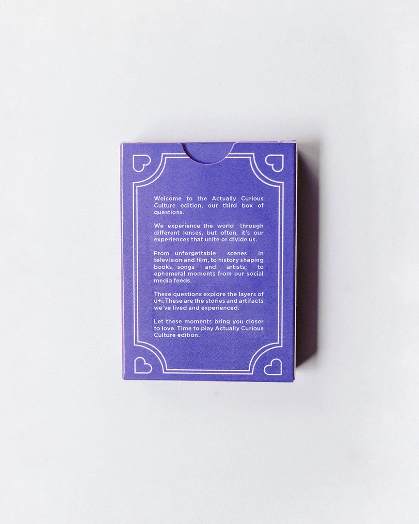 A card game and a mission to spread empathy, Actually Curious helps players build connections through meaningful questions. The Culture Edition contains the lightest and most approachable questions in the collection. This 52 purple card deck is meant to be played as a warm-up to the Happy Hour or Curiosity Editions. With the Actually Curious Culture Edition, your game night will illuminate commonalities and find a middle-ground regardless of age, gender, background, or political affiliation.