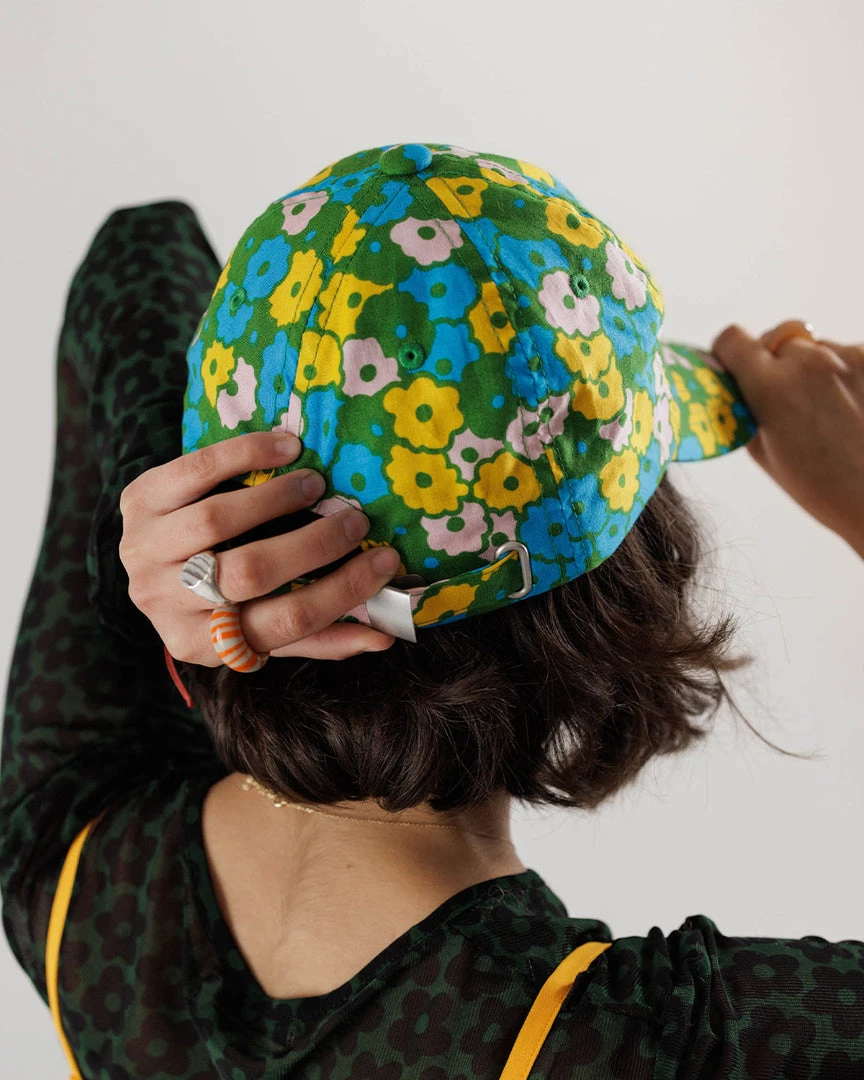Take us out to the ballgame—with some nachos and this baseball cap from Baggu! It has an adjustable fit and fun floral print.