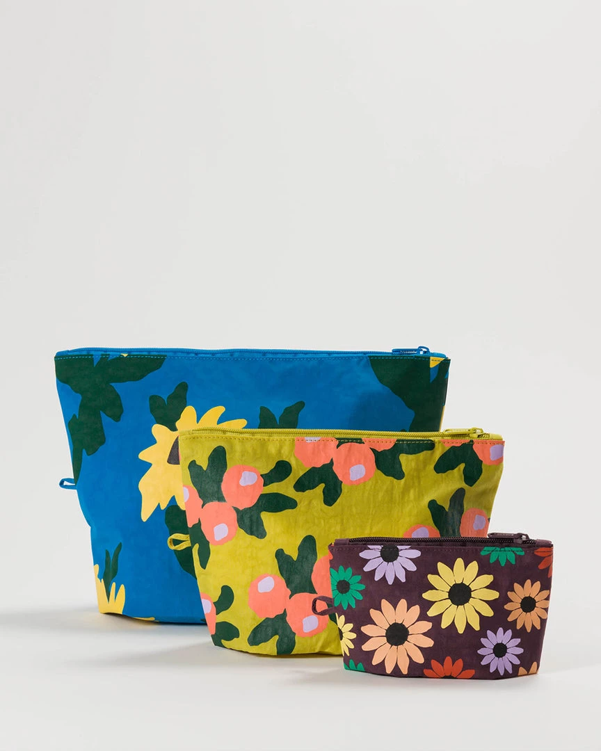 Almost everyone on our team has this 3-pouch set by Baggu. Why? Well, these pouches are perfect for traveling, they’re washable, they lay flat when you’re not using them (easy storage!), and they’re just ridiculously cute.
