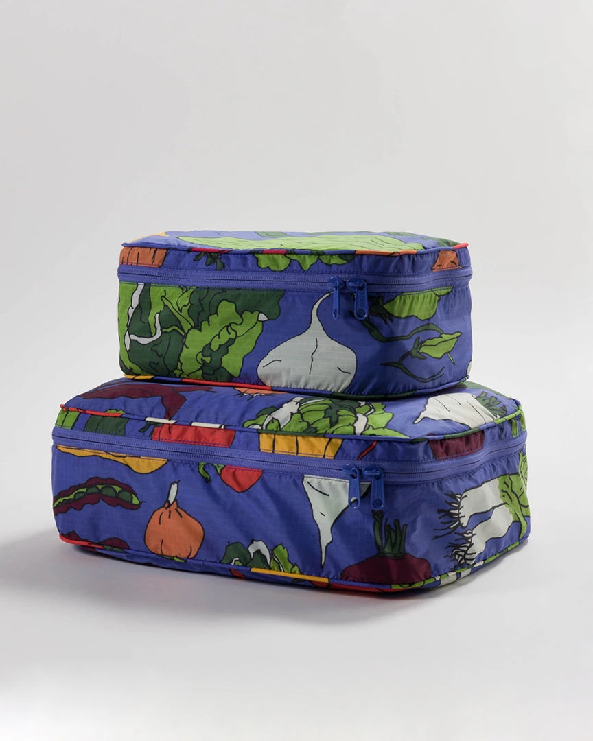 Just wait until you see what these storage cubs have in store! From Baggu, you’ll get a set of two with double zippers, machine washable fabric, and fun farmer’s market vegetable print