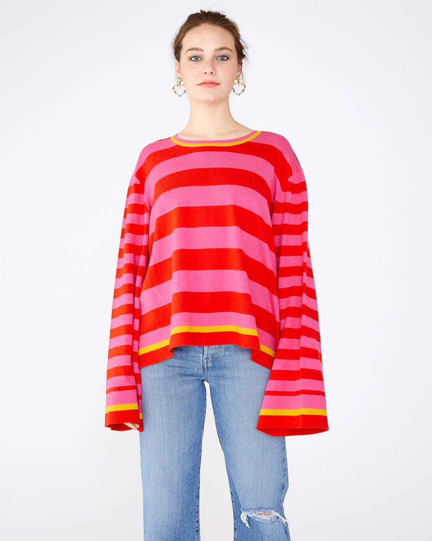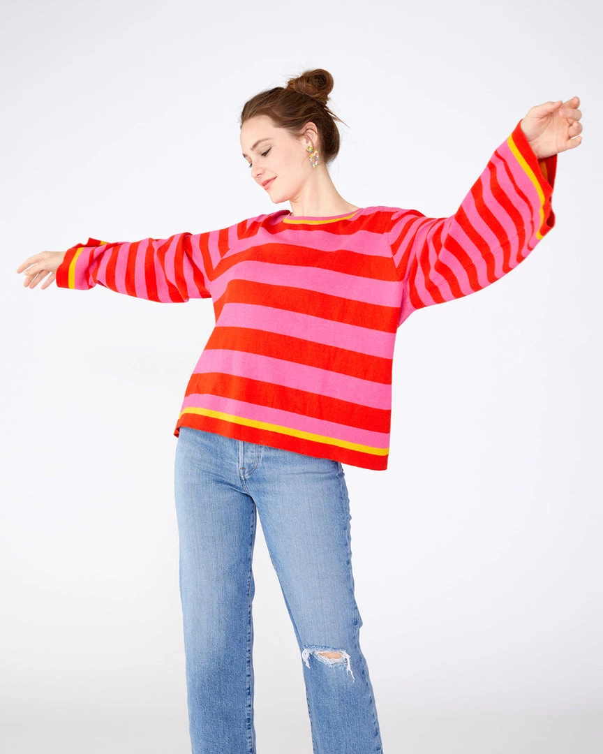We looked all over, but we could never find a pink and red striped sweater that was both comfortable AND stylish. So we just made one for ourselves! This knit sweater was made with a non-itchy cotton & wool blend. It also has bell sleeves and a boxy fit with little yellow details (which kind of reminds us of Big Bird but in the best way possible).