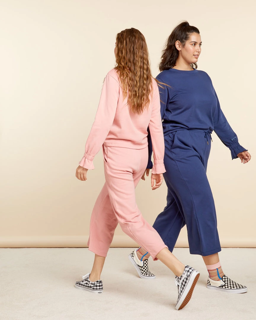 Our second favorite kind of ruffles are the ones on this sweatshirt. (The first are the ones on the potato chips.) This soft, comfortable long sleeve ruffled sweatshirt has a relaxed fit, slightly cropped length, and an embroidered ban.do logo on the sleeve.
