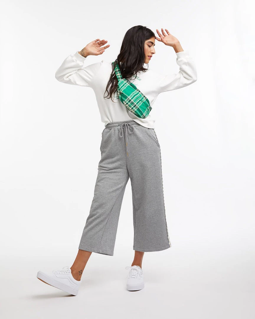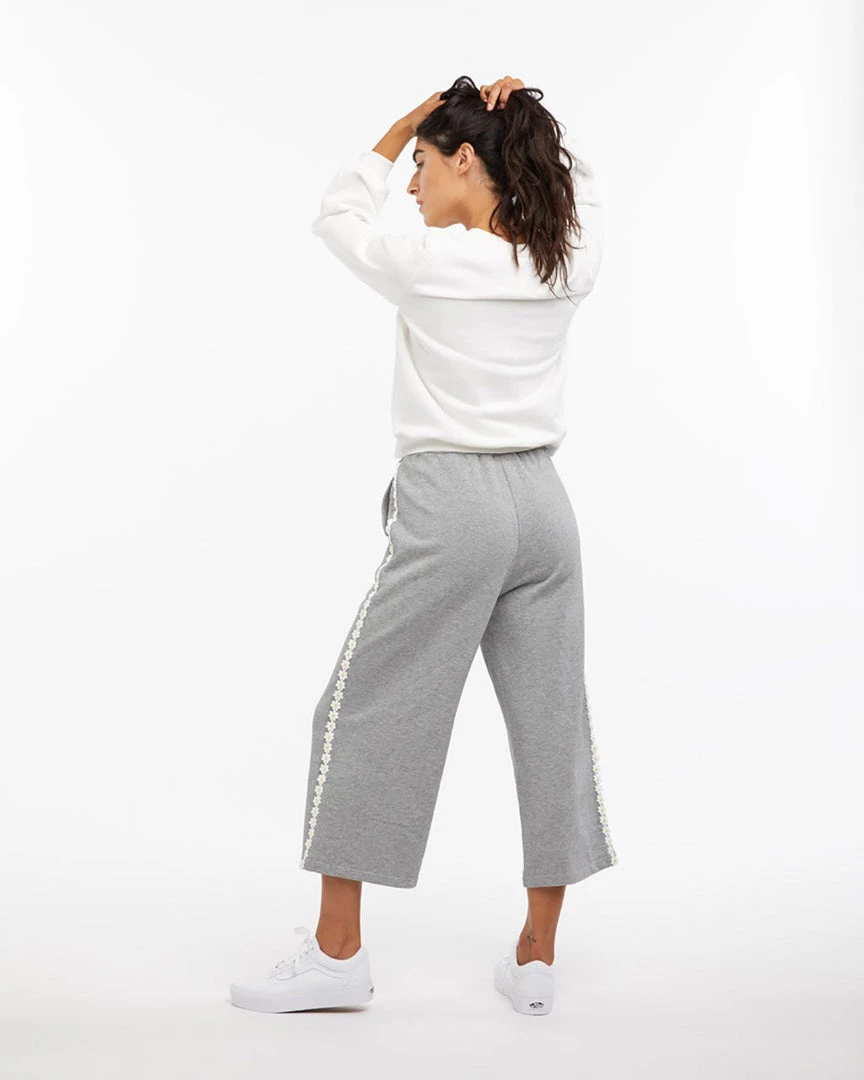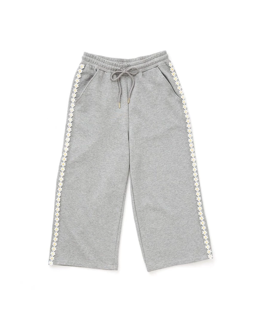 Why wear regular sweats when you can wear sweats with daisies down the sides? These soft, comfortable sweatpants have wide legs, a slightly cropped length, and a daisy applique trim.