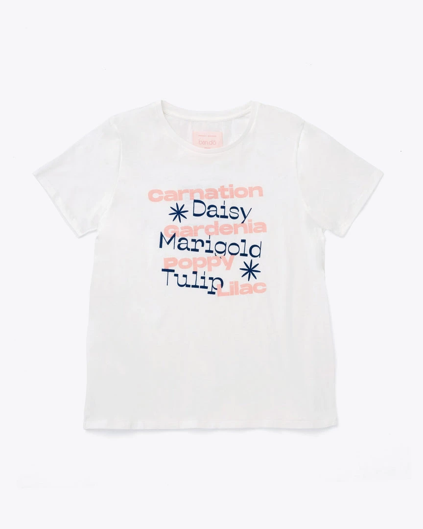 Flowers are very cool, so we listed some of them on this t-shirt and made it look like they’re all part of a hip band. This t-shirt also has short sleeves, a crewneck, and flocked details.