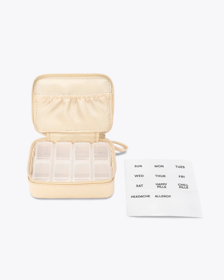 Brighten up your pill routine. This is a leatherette zippered case that has an interior pill separator for all days of the week (+ more).