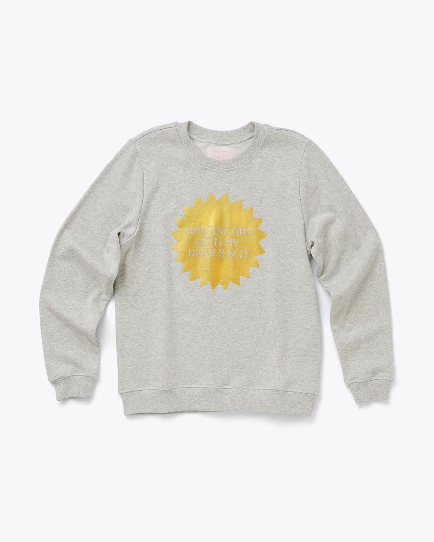 We call dibs on hanging out with your higher self when you’re done. This soft, comfortable long sleeve sweatshirt has oversized voluminous sleeves and a fuzzy flocked design.