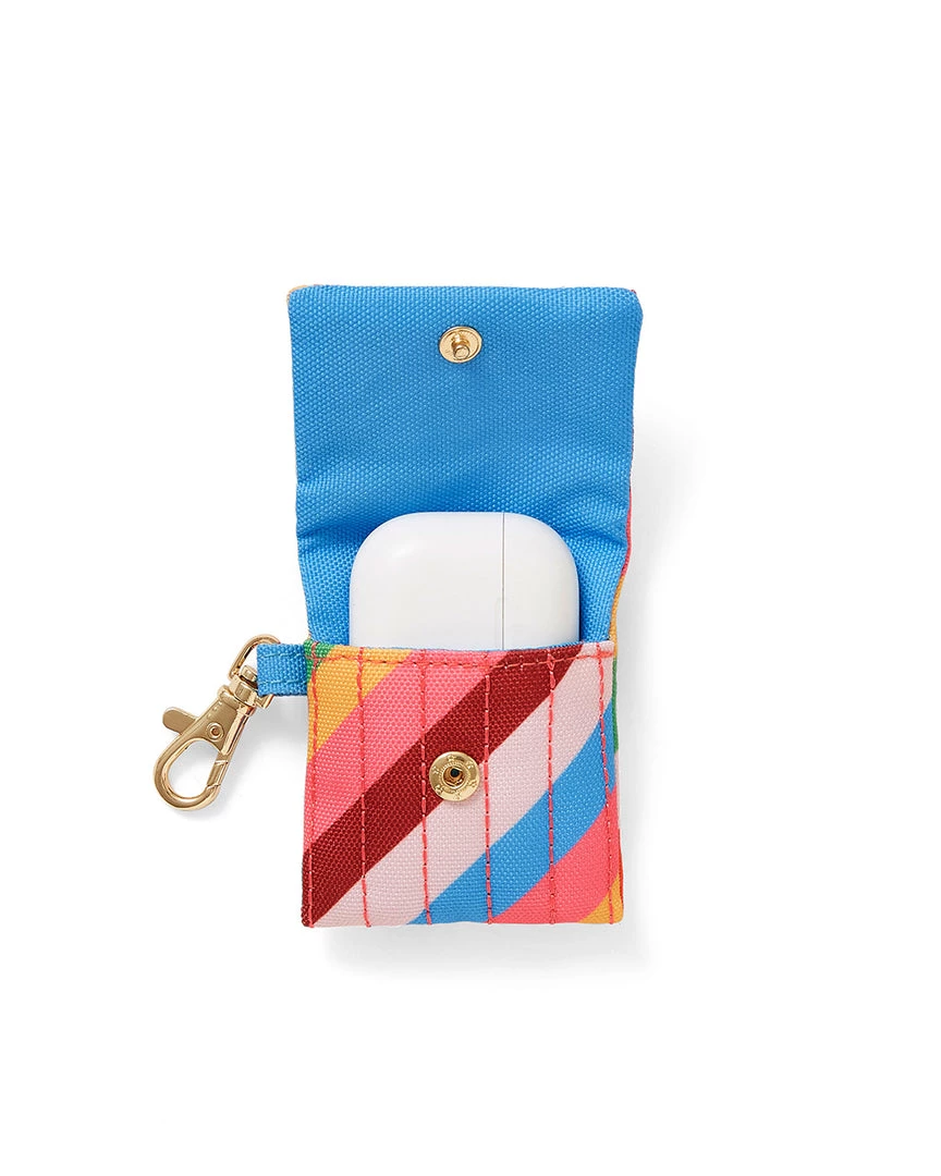 A handy new home for your earbuds. This case has a quilted exterior, snap closure, and gold clip.