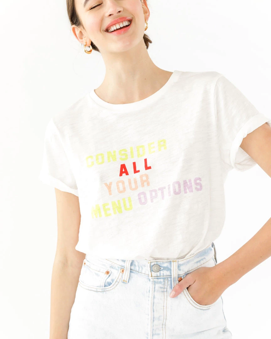 For your consideration… All your menu options. In restaurants and in life in general, this tee we made with our friend Katie Kimmel is here to remind you to think through all of your options. Because we believe that it’s important to try new things, no matter how good your usual order is.