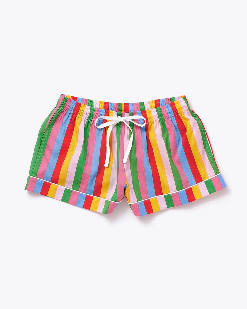 Whenever you need a pop of rainbow (i.e. always). These soft, comfortable leisure shorts have a classic fit with a 2.5” inseam, side pockets, and an allover rotary print.