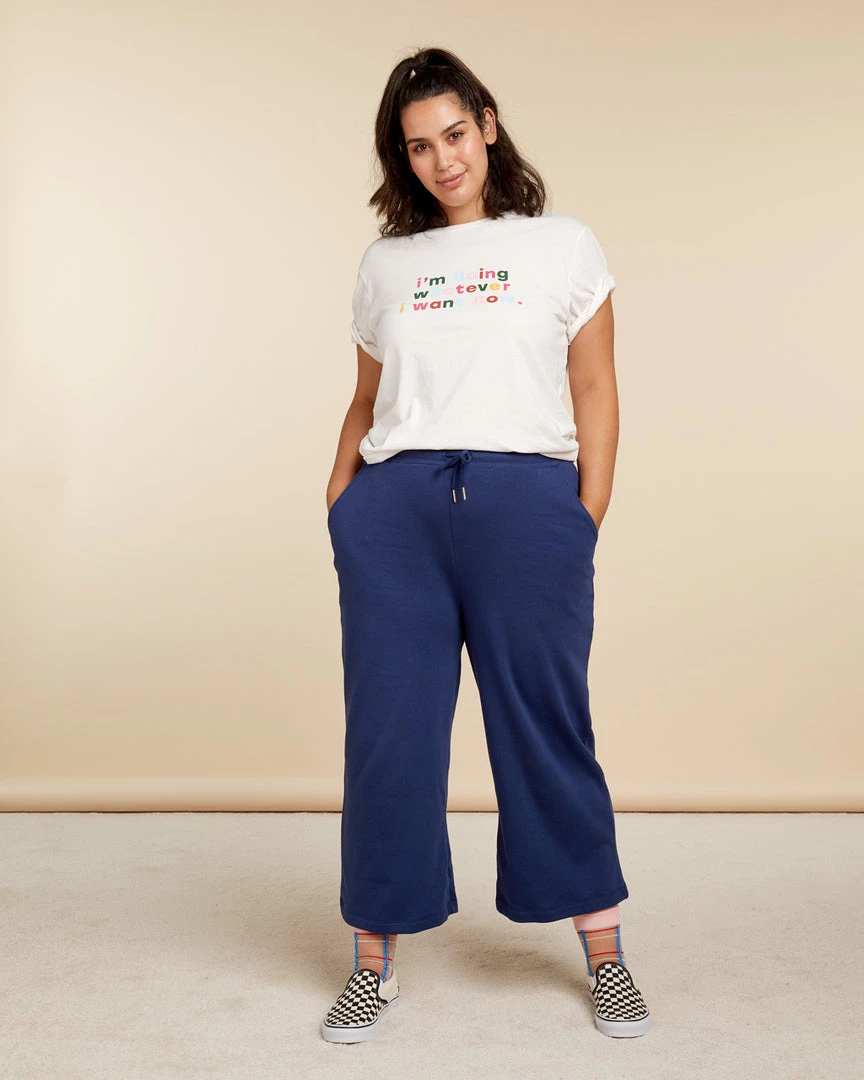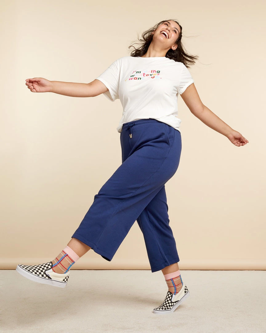 Ain’t no sweat pants wide enough. Well, except for these soft, comfortable wide leg sweatpants with a relaxed fit, cropped length, and an embroidered ban.do logo.