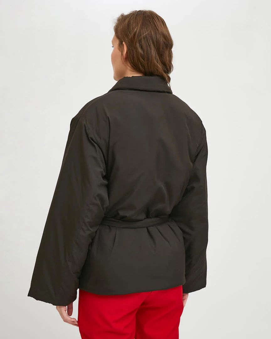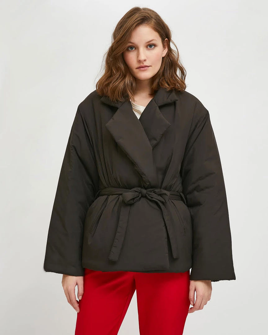 The casualness of a puffer meets the sophistication of a belted coat. This is from Compañía Fantastica, and it has a lapel collar, adjustable tie, and cropped length.