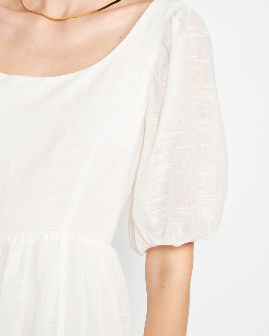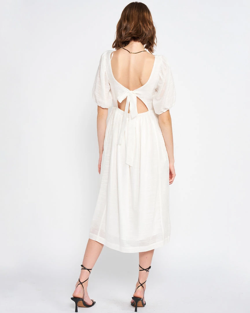 Your 2022 frolicking dress is here. From En Saison, this has a round neckline, slightly puffed sleeves, and a midi length.