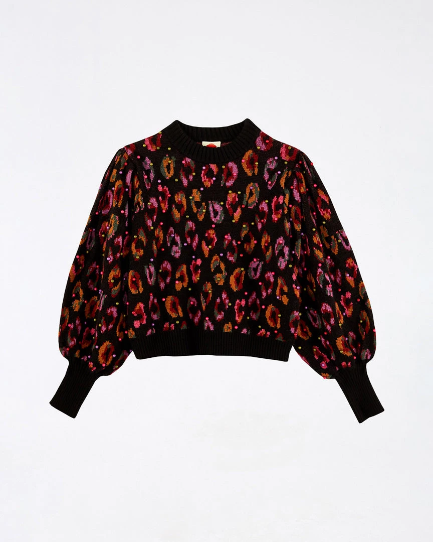 No psychedelic leopards were harmed in the making of this sweater. From Farm Rio, it has a mock neck, oversized sleeves with slim cuffs, and beaded accents.