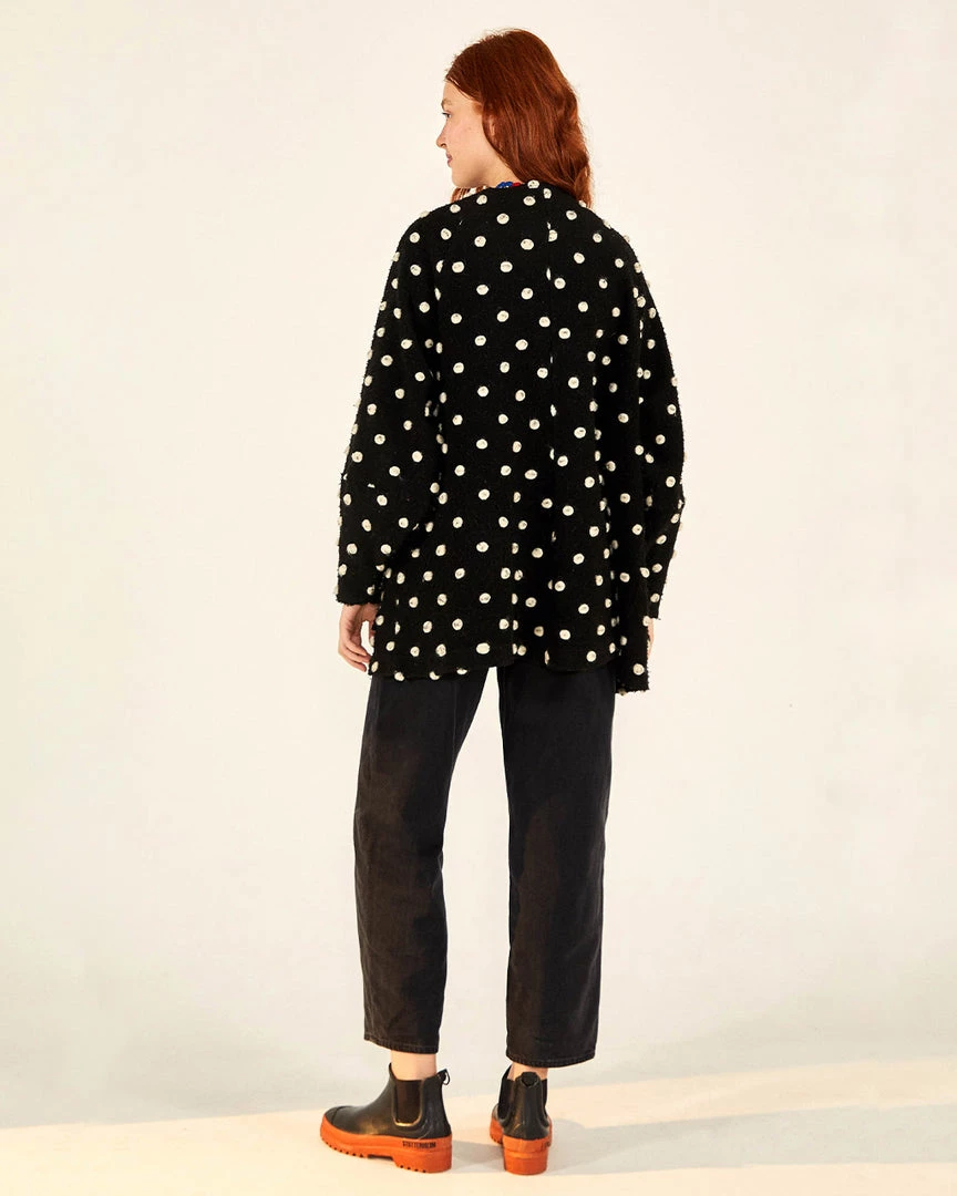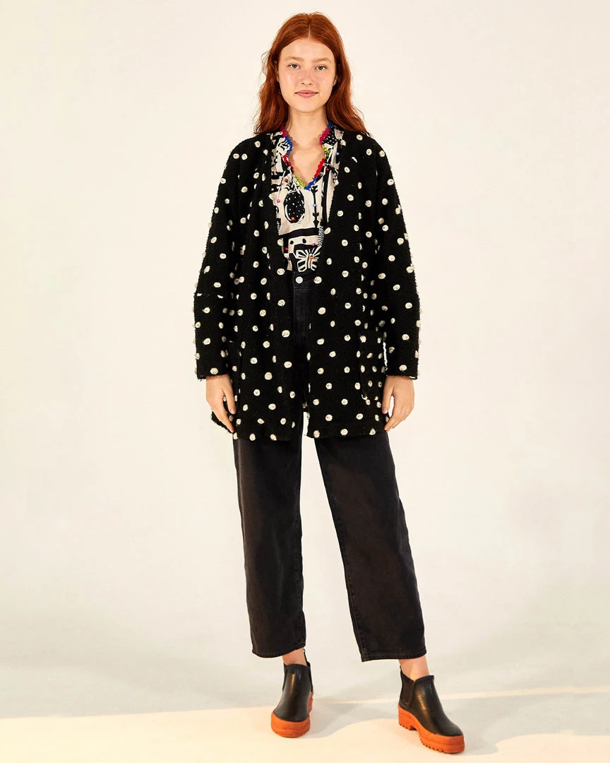 Yes, this would be a great addition to your cold-weather wardrobe. It’s a cardigan from Farm Rio, and it has long sleeves, a slightly oversized fit, and polka dots all over.