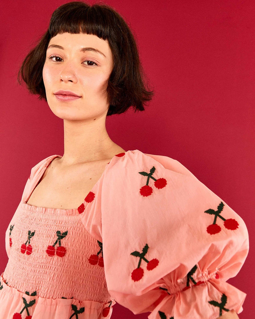 We strongly approve of cherry dresses. This one from Farm Rio has a square neckline, puff sleeves, and maxi length.