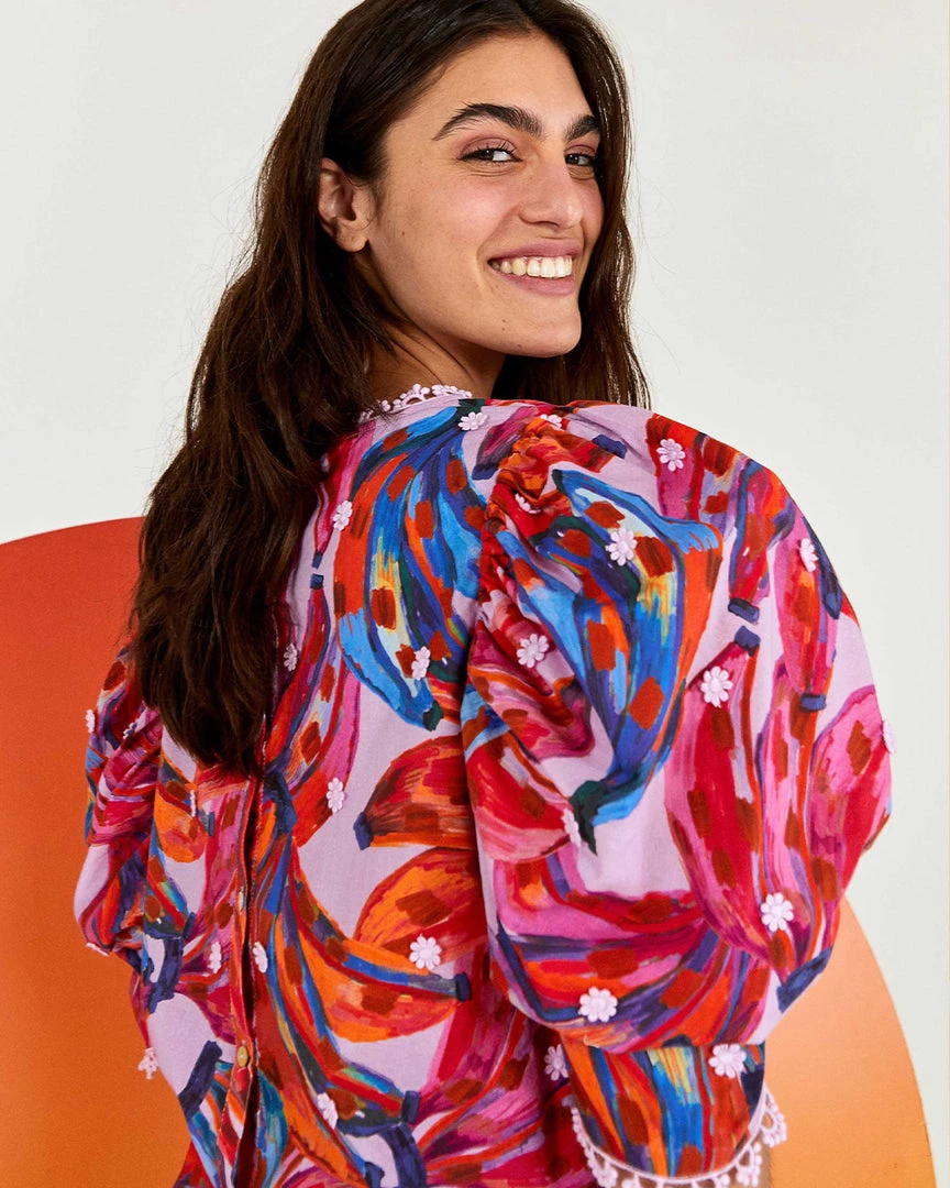 Bananas! On! A! Blouse! This is from Farm Rio, and it also has puff sleeves, lace detailing, and flower appliqués.