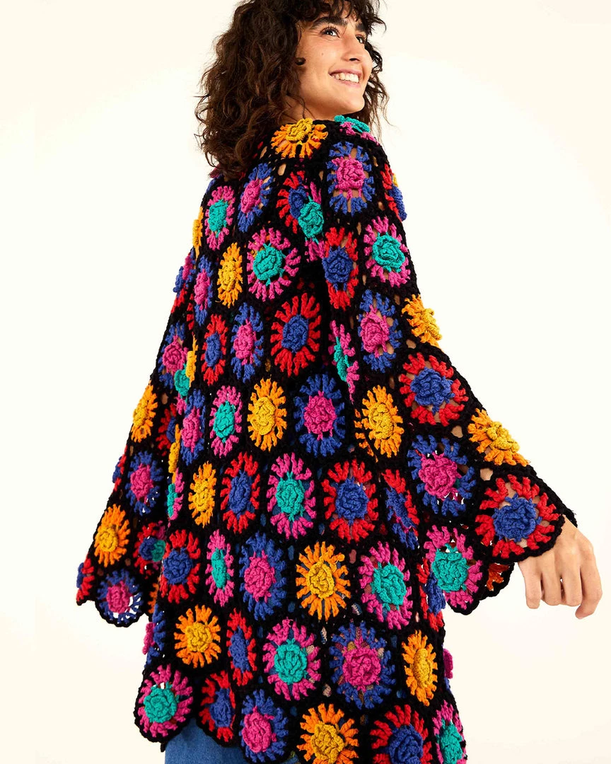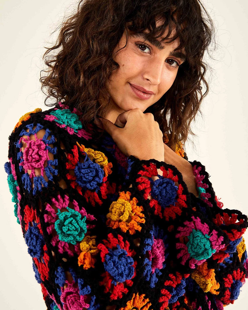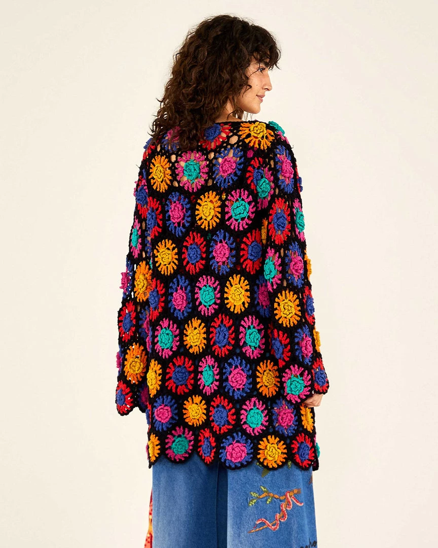 This cardigan is a real crocheted dream. From Farm Rio, it has an easy fit, V-neck, and midi length.