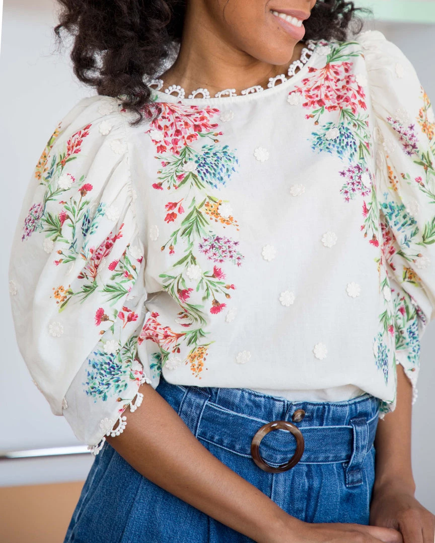 A little Bridgerton for your wardrobe. This top from Farm Rio has incredible puff sleeves, embroidered details, and crochet trim.