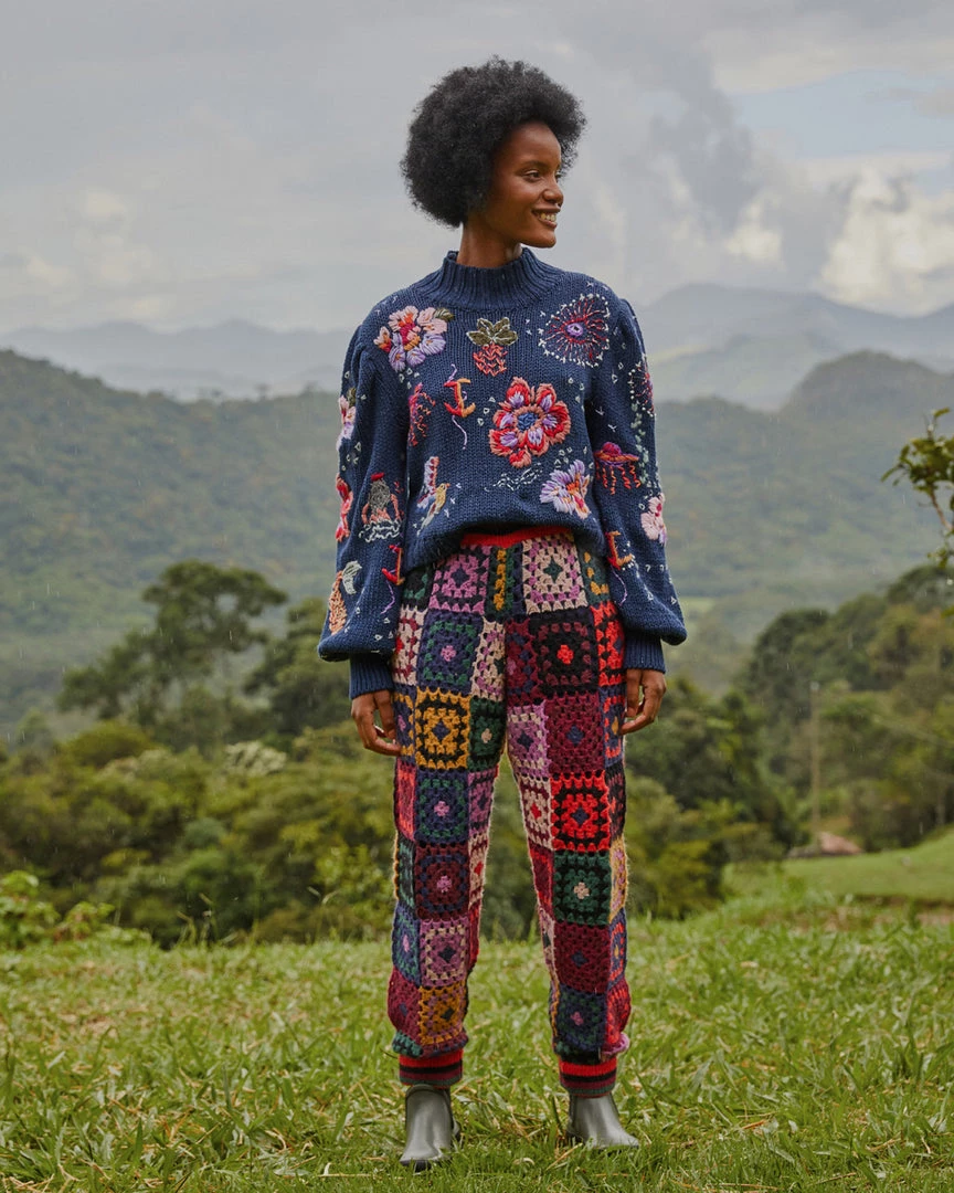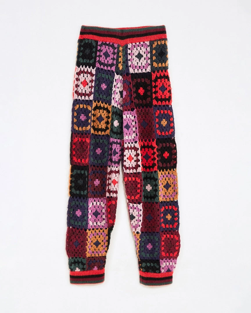Sweaterpants: exactly what the world needs now. From Farm Rio, these have an all-over crocheted design, elastic waist, and multicolored ribbed trim.