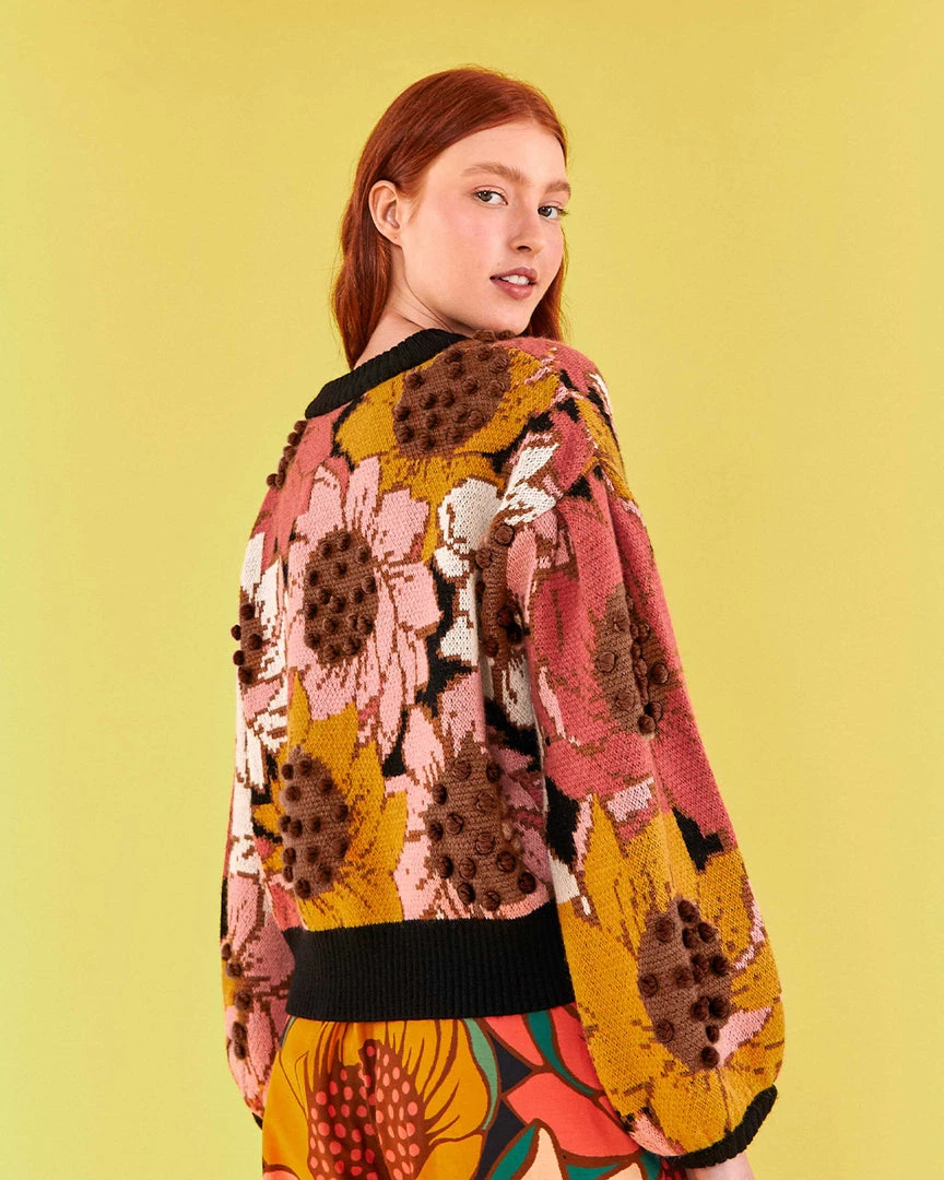Bring us all the sunflowers. From Farm Rio, this sweater has an oversized fit, ball appliqués, and a slightly cropped length.