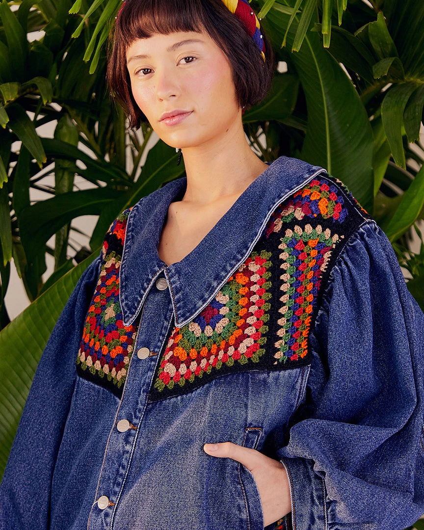Yeah, you’re going to need this one. It’s a denim jacket from Farm Rio, and it has a Peter Pan collar, voluminous sleeves, and amazing crochet details.