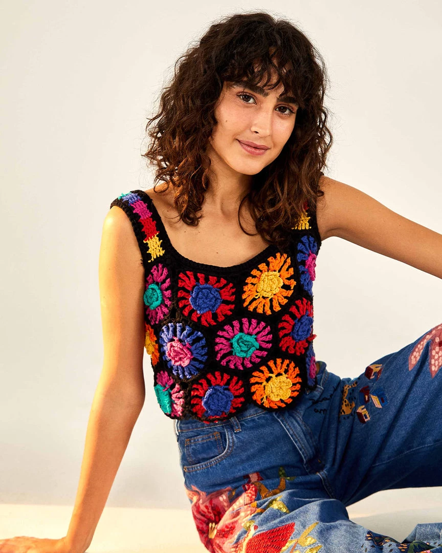 This top is a real crocheted dream. From Farm Rio, it has an easy fit, cropped length, and scalloped bottom.