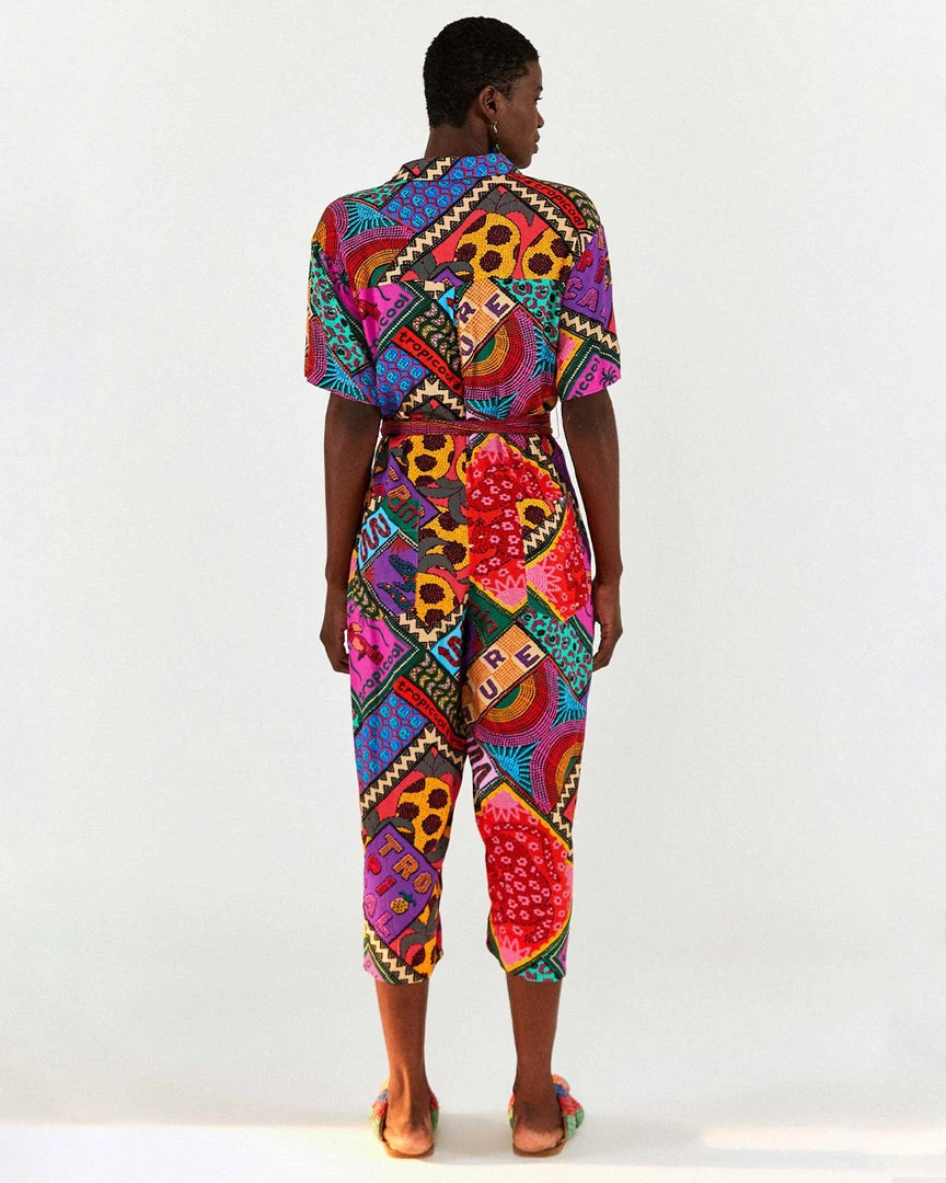 This incredibly colorful and amazing jumpsuit was made for you. From Farm Rio, it has an easy fit, button front, detachable belt, and cropped length.