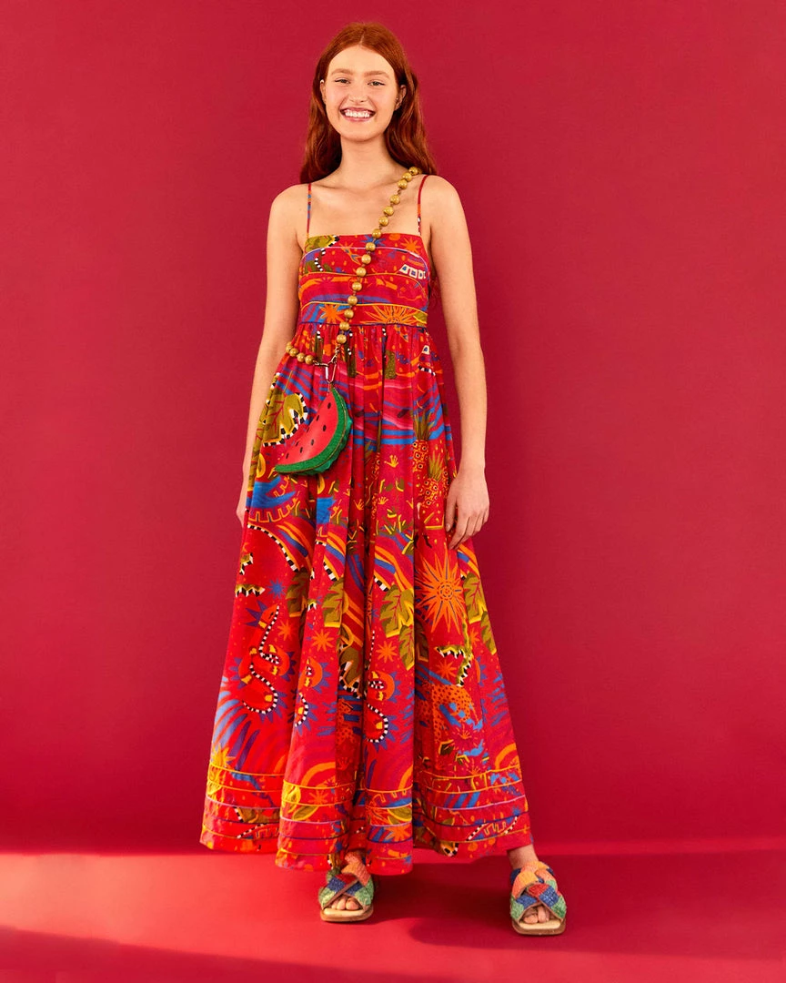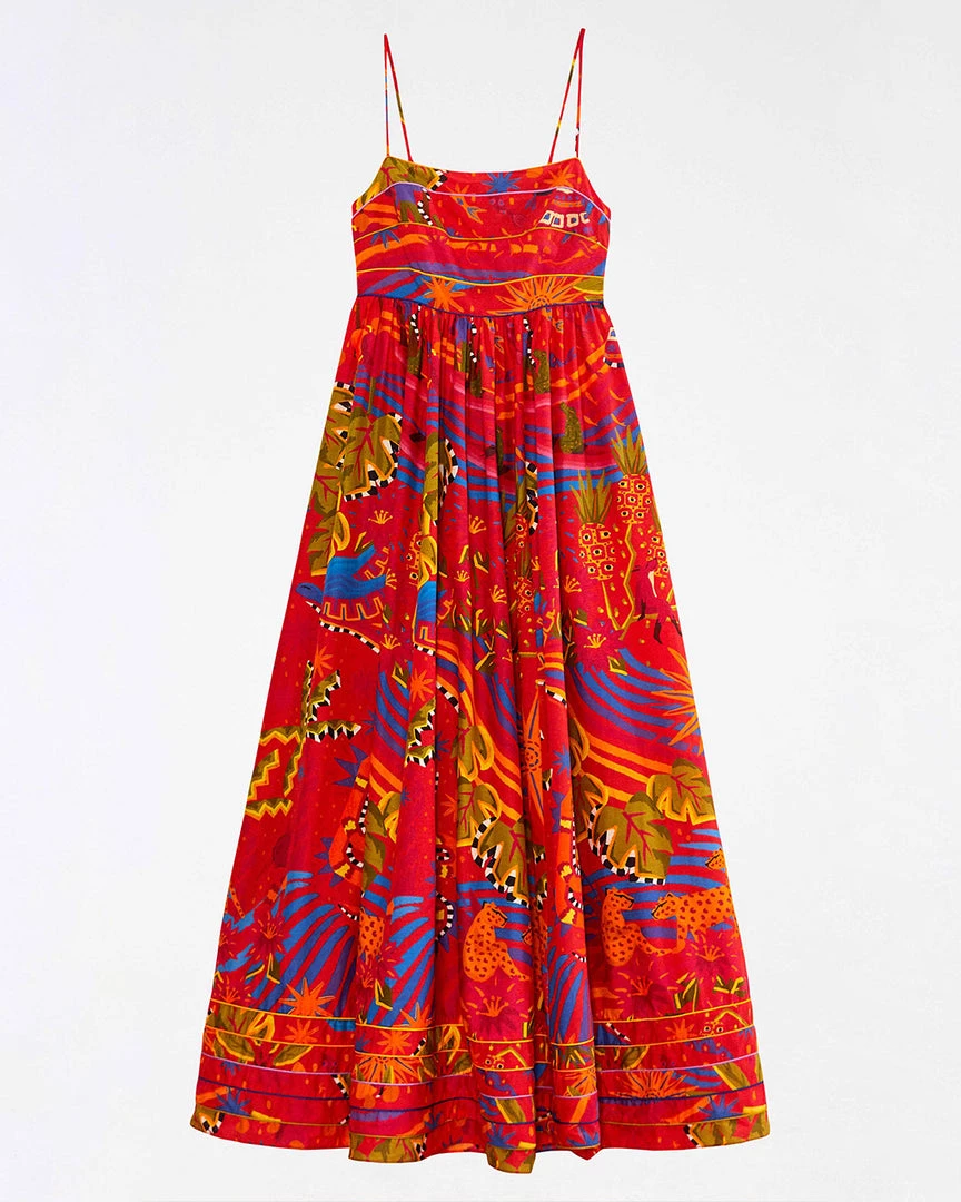 A wearable fairytale forest. This dress from Farm Rio has spaghetti straps, a fitted waist, and a maxi length.