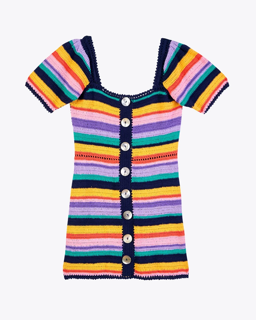 Like an incredibly magical vintage find. This crochet dress from Farm Rio has a square neckline, short sleeves, and faux button front.