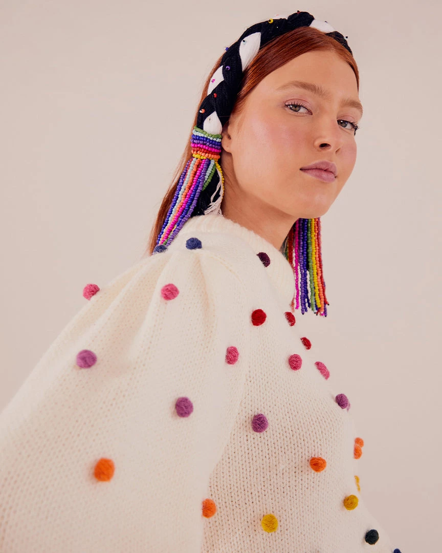 Your new party sweater. This is from Farm Rio, and it has a ribbed mock neck, long sleeves, and rainbow pom poms all over.