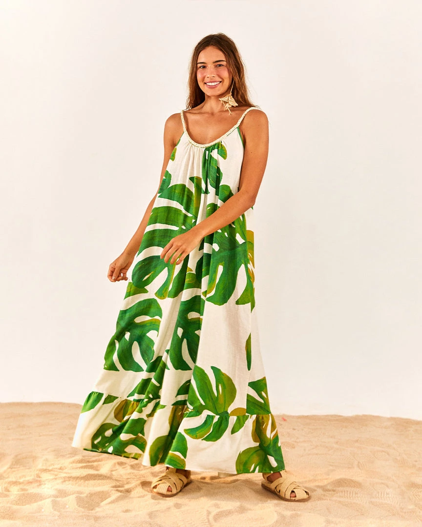 Monstera maxi dress?! Say no more. This is from Farm Rio, and it has a low back, easy fit, and ruffled hem.