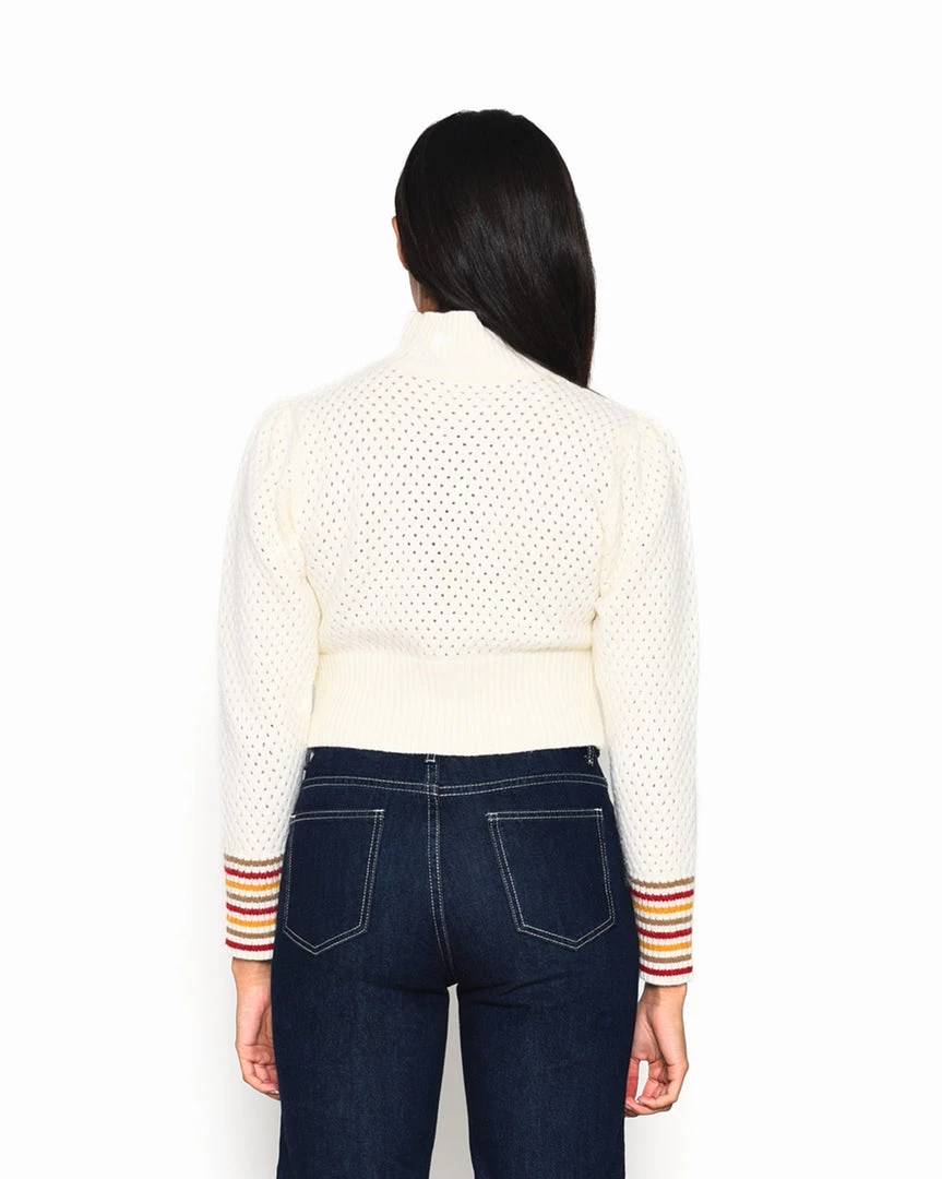 A little ’70s moment. This sweater is from Glamorous, and it has a mock neck, open knit details, and cropped length.