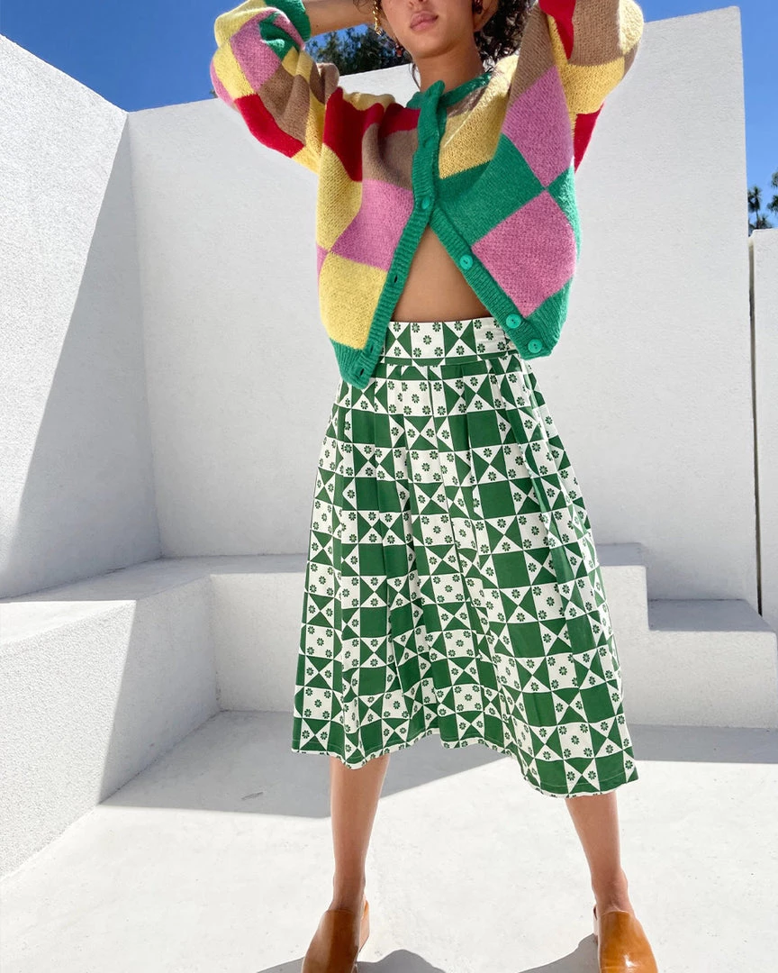 An incredible skirt for an incredible person (i.e. you). From Lisa Says Gah, this has a high waist, pleated front, and all-over quilt print.