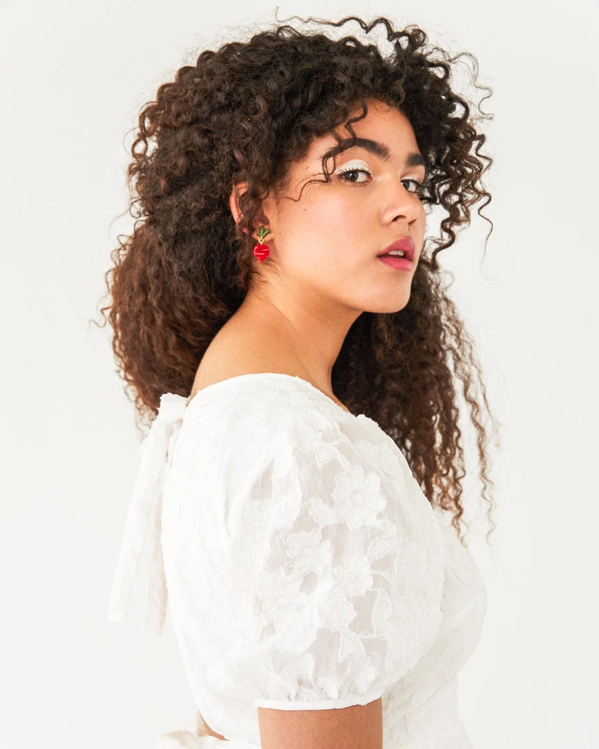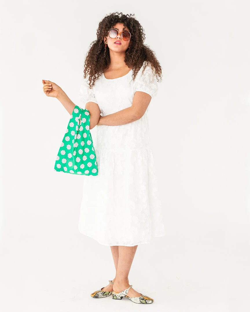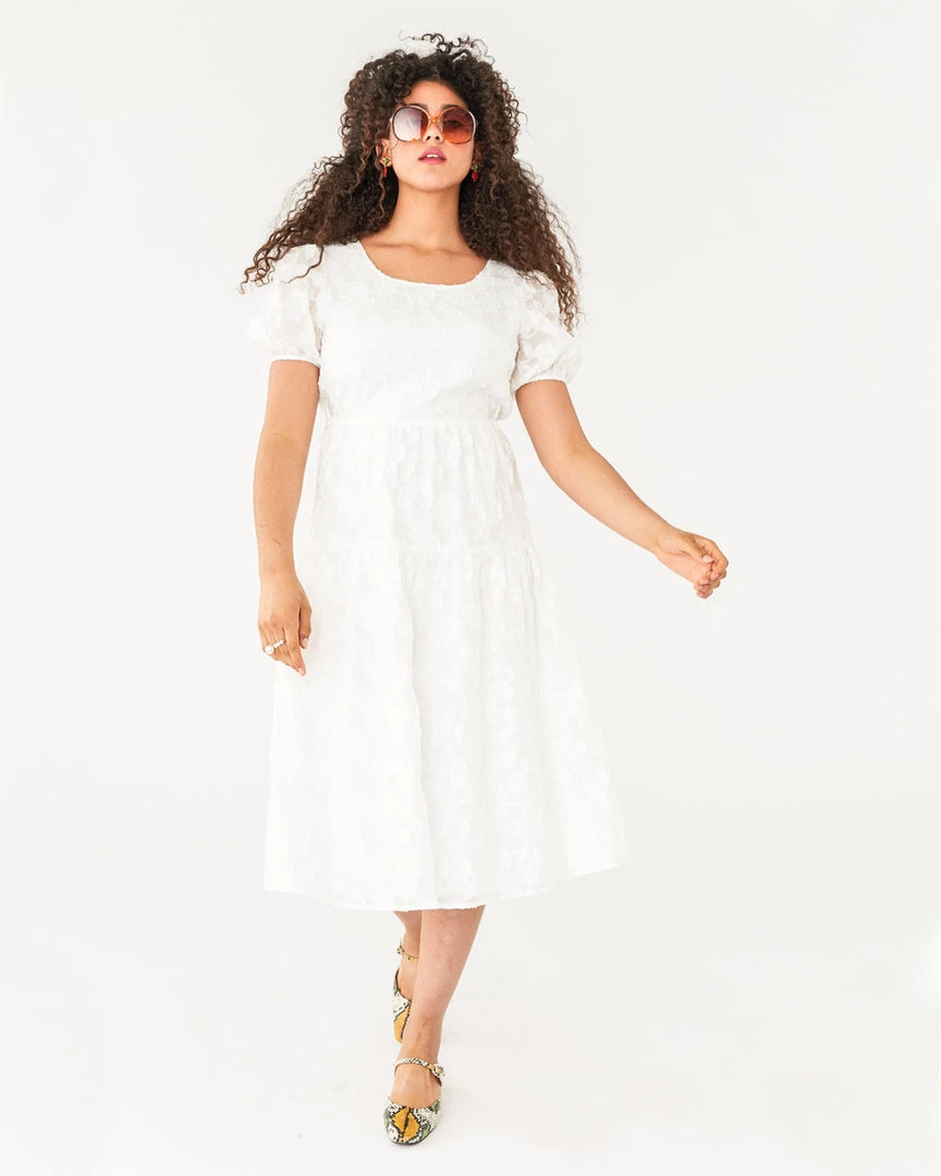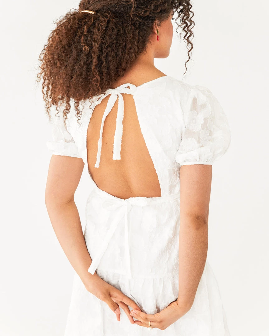 THE dress to wear while frolicking in a field of daisies. By Moon River, it has a subtle floral pattern with crinkled texture, puff sleeves, and an open back with ties.