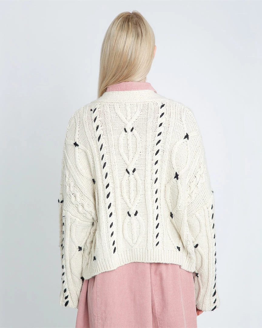 A cool unique cardigan that also happens to go with everything? Oh yeah. From Native Youth, it has drop shoulders, a button front, and black contrast stitching.