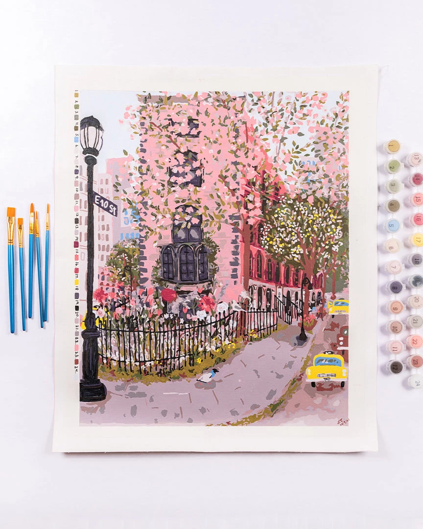 - Includes: 16 in. x 20 in. ready-to-paint premium printed canvas, a 5 brush set, and 24 handy little pots of acrylic paint