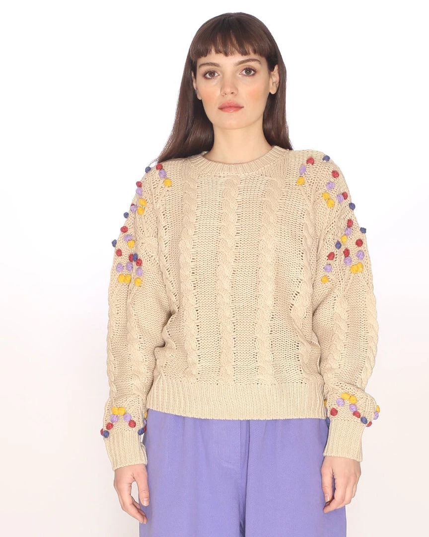 Cable knit meets confetti. This sweater from Pepa Loves has a crew neck, ribbed trim, and pom pom details.