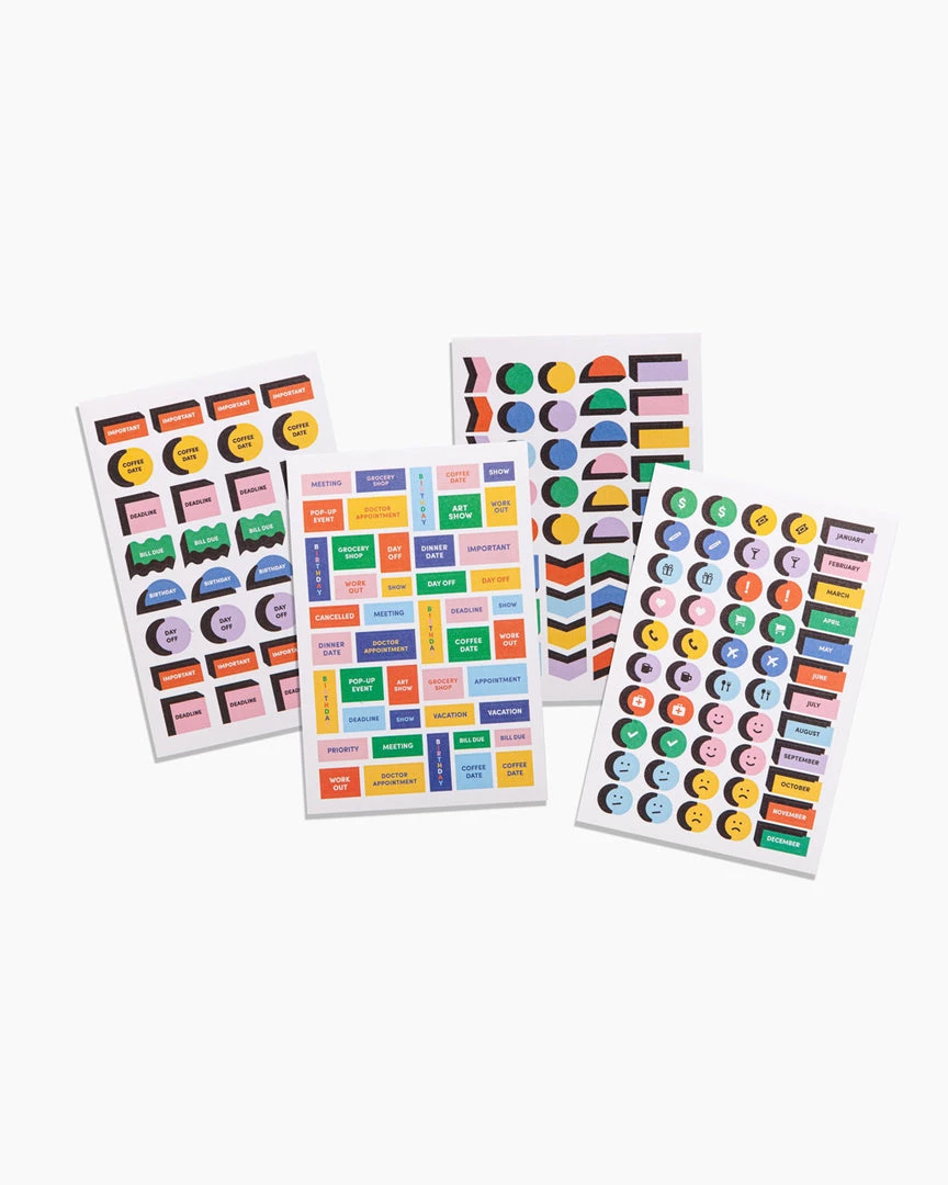 - 4 sheets with 186 stickers total featuring categories, months, symbols, and blank stickers to customize.