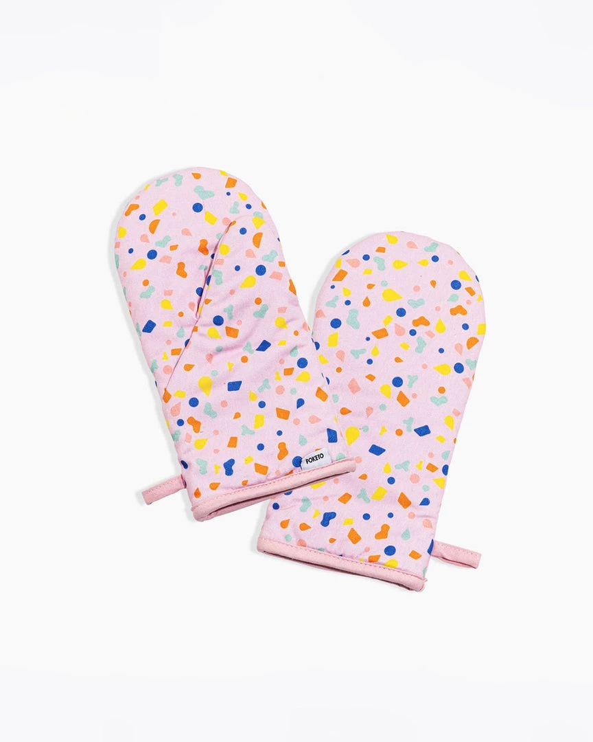 A pair of perfectly pink oven mitts featuring a colorful confetti pattern that’s guaranteed to bring the party into the kitchen.