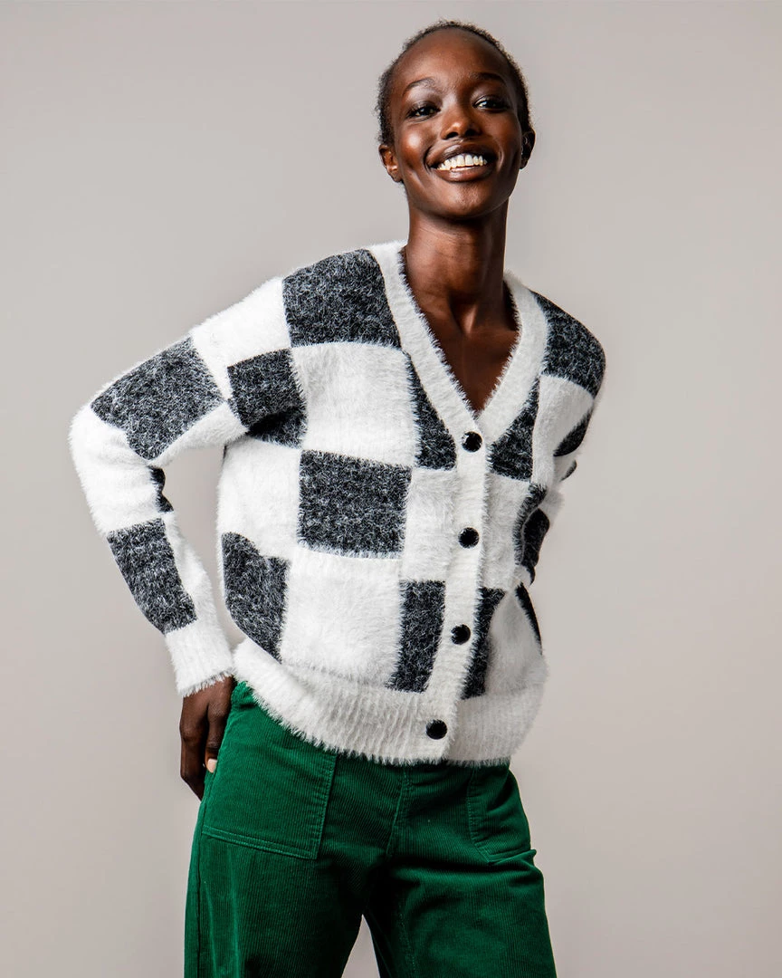 Check you out. This super fuzzy cardigan from Rachel Antonoff has a V-neck, button front, and patch pockets.