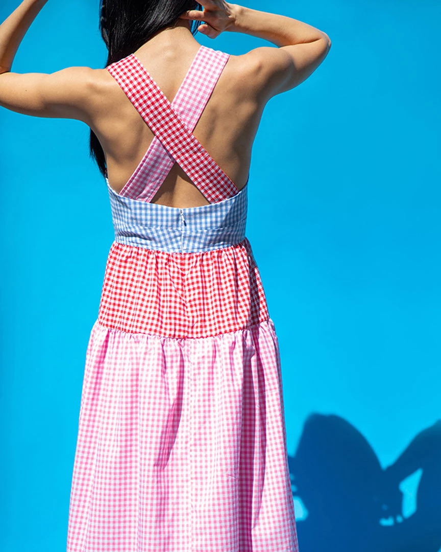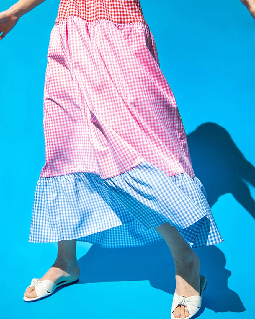- Tiered pinafore maxi dress in pink, blue, & red gingham