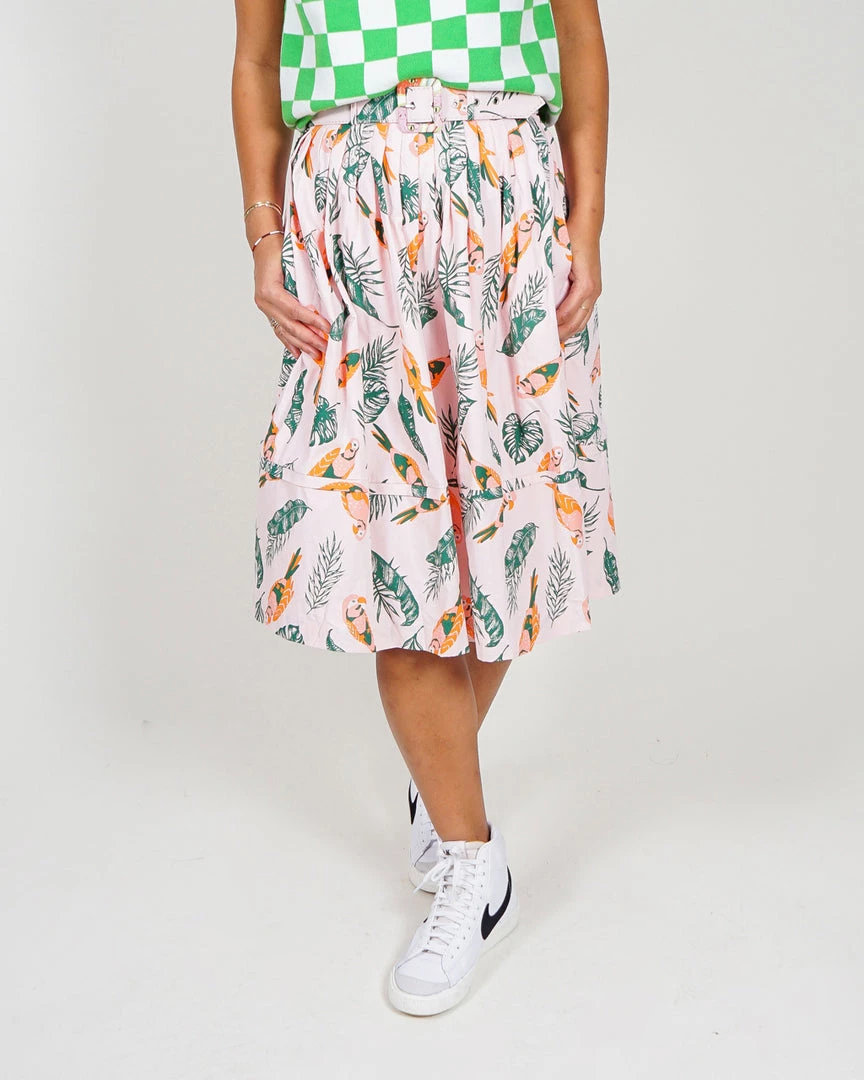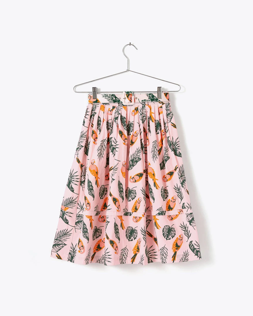 Birds on a skirt—what could be better? This is from Saint Geraldine, and it has a functional belt, side pockets, and below-the-knee length.