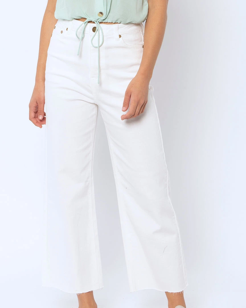 Switch it up with some white denim. From Sisstrevolution, these have a slightly wide leg, cropped length, and raw hem.
