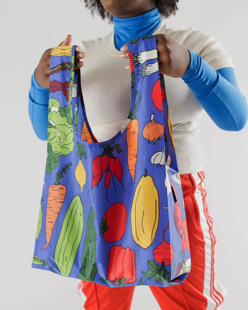 Q: What is super lightweight, can hold 50 lbs., and has a vegetable print all over it? A: This bag from Baggu! Seriously, it can hold fifty pounds. That’s like two and a half watermelons. (FYI: We looked that up. We didn’t know a watermelon’s weight offhand.)