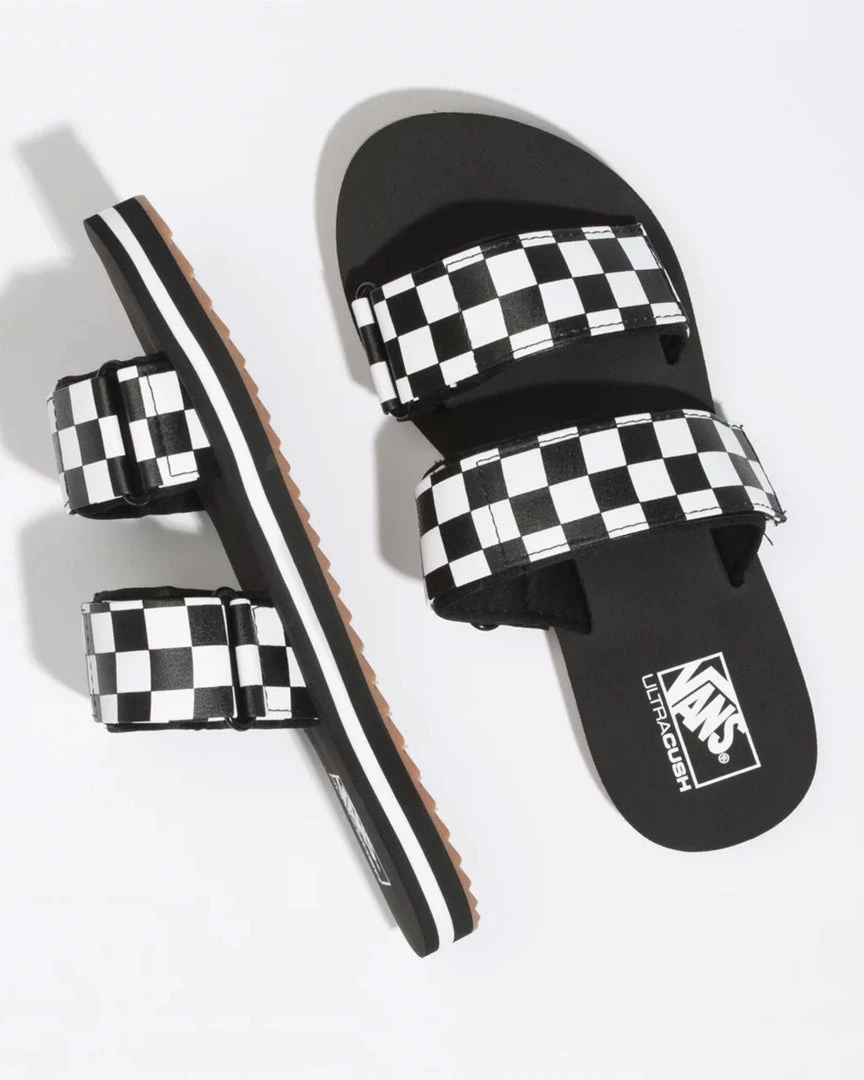 Poolside Vans. These adjustable sandals have two suede straps, comfortable ULTRACUSH™Lite footbeds, and sawtooth treads.
