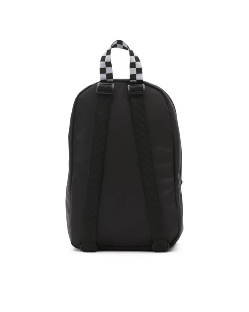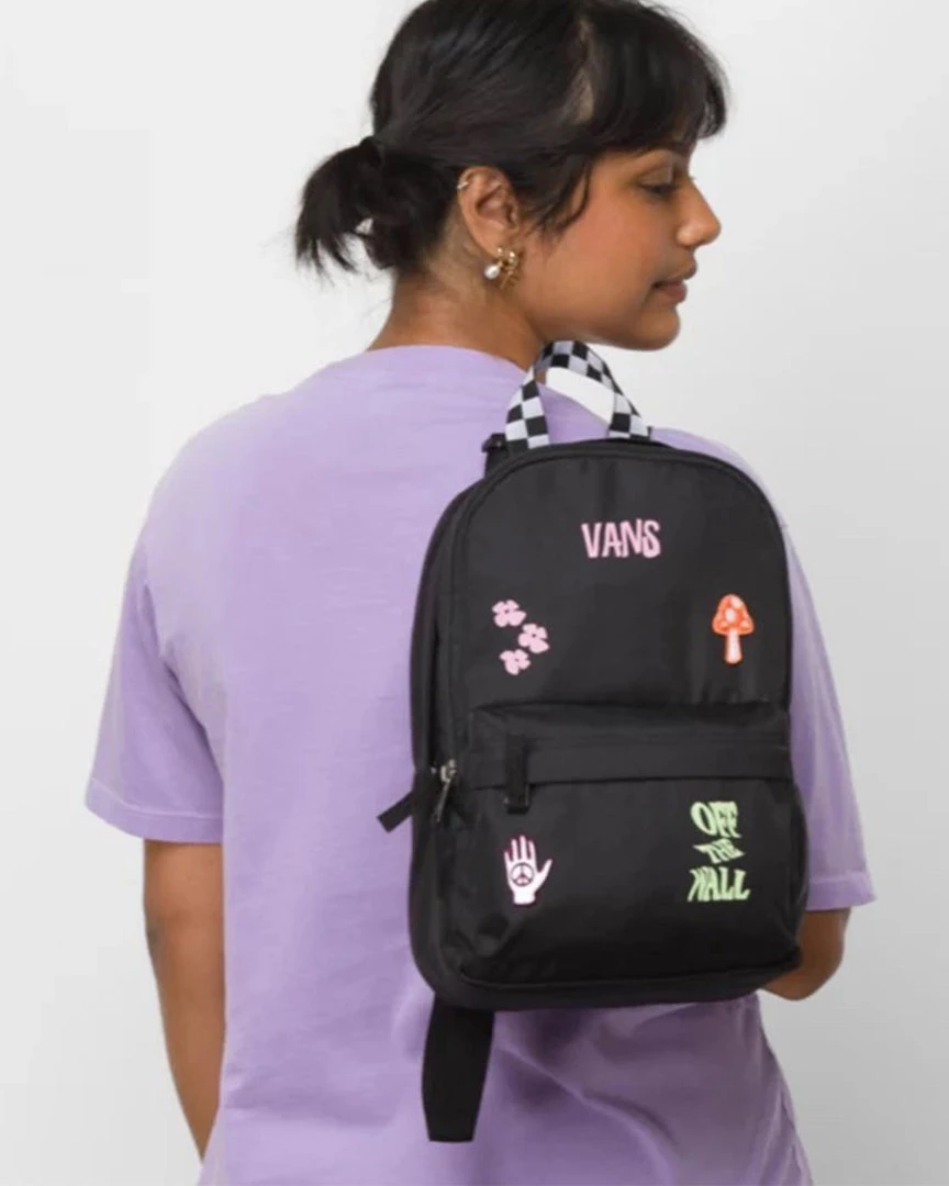 A small backpack with big personality. From Vans, this has adjustable straps and is covered in both screen-printed graphics and patches.