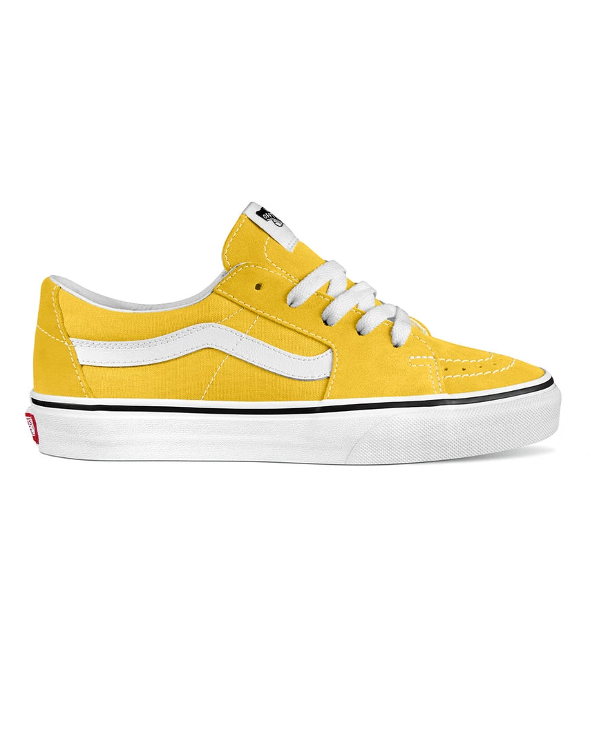 Be your own sk8er boi. These low tops from Vans feature yellow suede uppers, supportive padded collars, and rubber waffle outsoles.