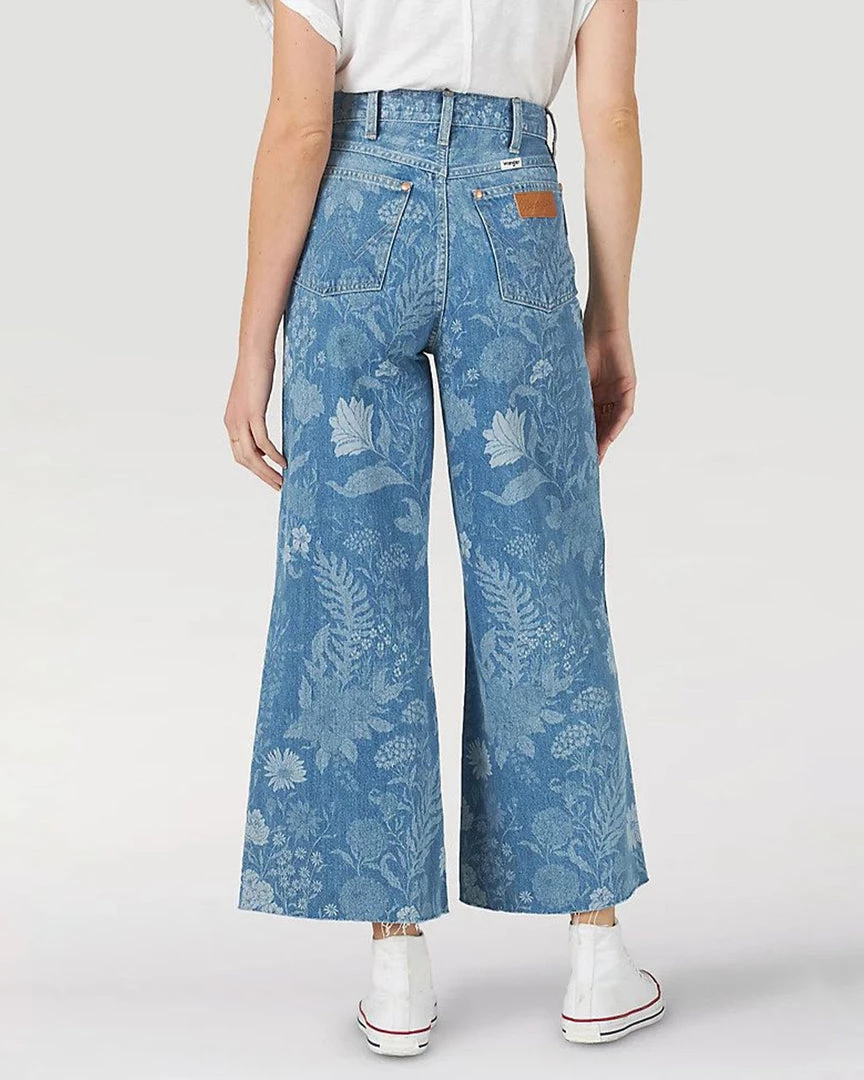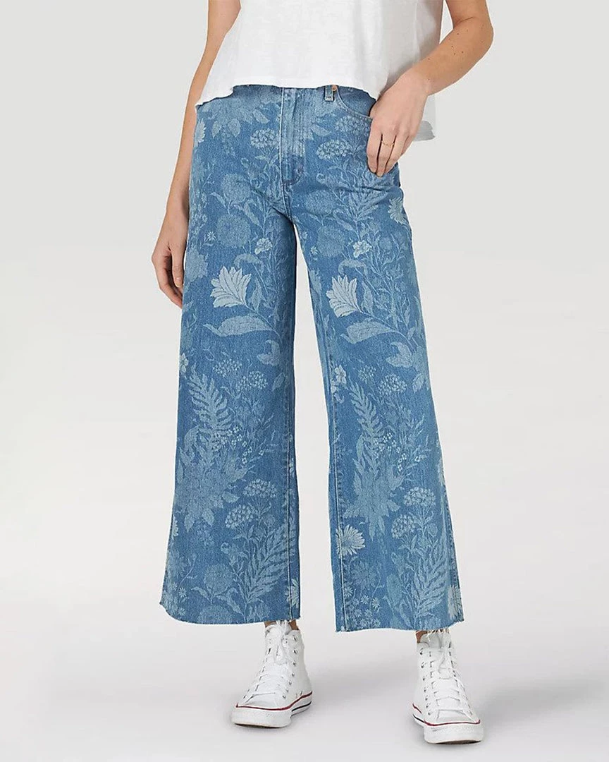 Not just any old blue jeans. From Wrangler, these have a high waist, bleached floral design, and cropped frayed hem.